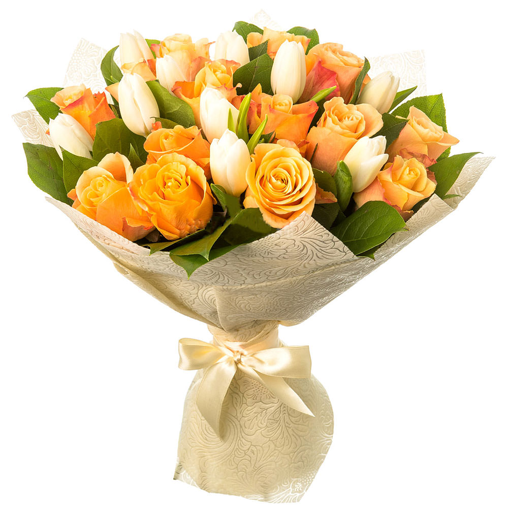 Роза одноголовая, тюльпаны, зелень.
